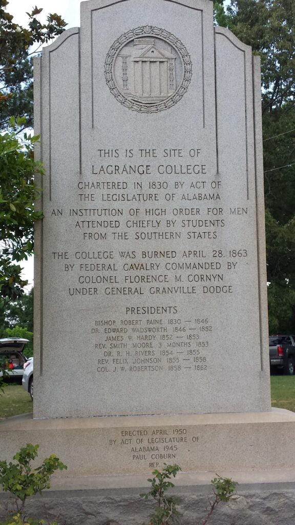 The history of La Grange College is intertwined with the broader narrative of the American South. The college was attended primarily by young men from southern states and was led by a series of notable presidents, including Bishop Robert Paine and Dr. Edward Wadsworth. The destruction of the college by Union forces marked a significant moment in the Civil War, symbolizing the disruption of southern institutions during the conflict. Despite its destruction, the legacy of La Grange College lives on, with the University of North Alabama recognizing it as a predecessor institution, celebrating its 175th anniversary as part of its own history[2].